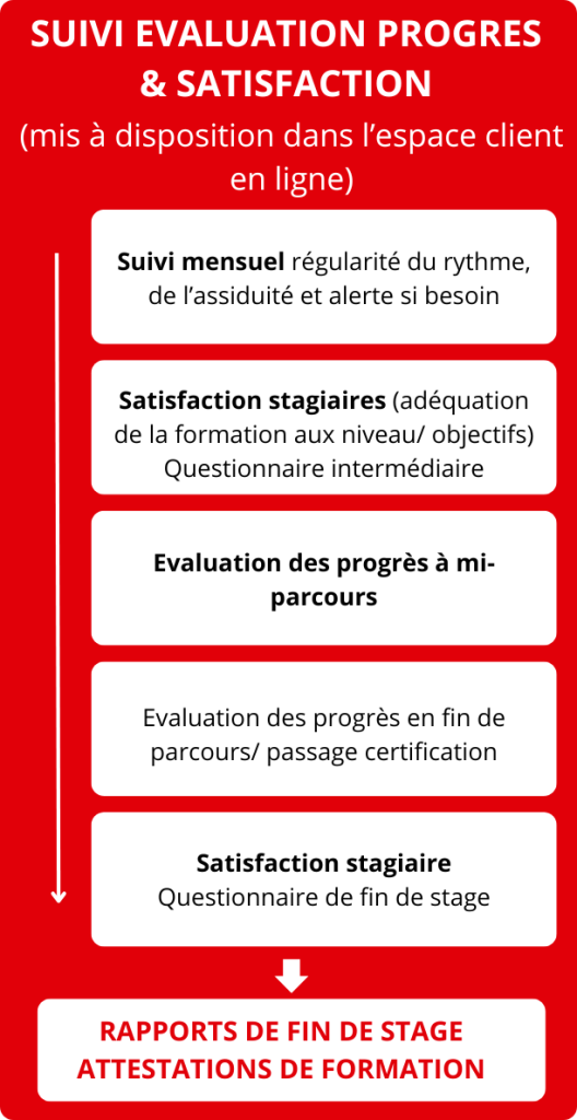 Nous nous engageons à piloter les formations et vous informer régulièrement sur les critères quantitatifs et qualitatifs des formations en cours,